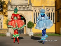 The Christmas Ladies are a chatty, playful stilt act full of Christmas cheer. Dressed in sparkling, oversized costumes, they are the perfect blend of elegance and festive frivolity. Their headpieces glow with festive lights, while their skirts and sleeves shimmer with every graceful step.
