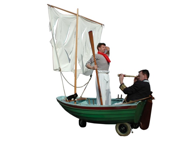 Following on from the success of Artizani’s original nautical seaside walkabout ‘Punt’, this ‘street boat’ is based on an 8ft clinker-built skiff. The show extends the fantastically surreal images of Punt and carries two hilarious and eccentric maritime characters into your event.