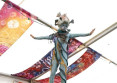 Perching high on top of a tricycle vessel, a giant Octopus steers through the crowd, pedalling with her twisted tentacles. She propels into a rocky outcrop covered in bladderwrack, from which two deep sea fish emerge and perform a series of acrobatic contortions as the tricycle cruises the currents.