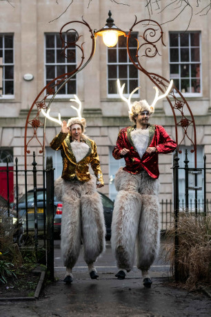 Celebrity reindeers Prancer and Dancer are coming out of Rudolph’s shadow to strut their stuff in the spotlight. Using their bouncy stilts, these posey prima donna reindeer trot around up on their hind legs, always up to bust some moves with their hooves.