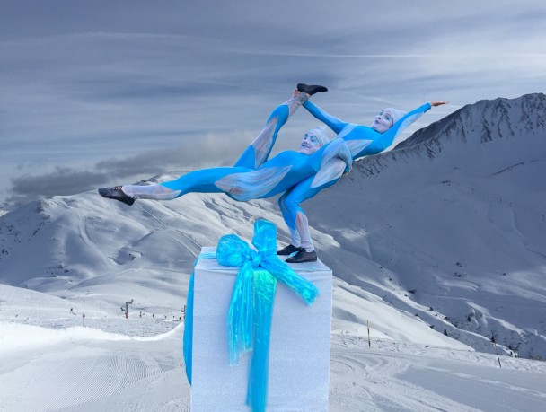 Suddenly the Gift Box bursts into life with arms and legs emerging at surprising angles. An exquisitely mischievous elf rises from within, striking acrobatic poses as she turns on top of a music box turntable. The Gift Box keeps on giving as another elf rises appears and the two perform an almost impossible series of sculptural balances on the top of the gift box.