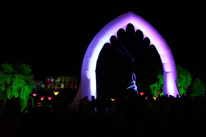 - An interactive show where the aerialist can interact with audience passing through the arch, her height manipulated by the crew.